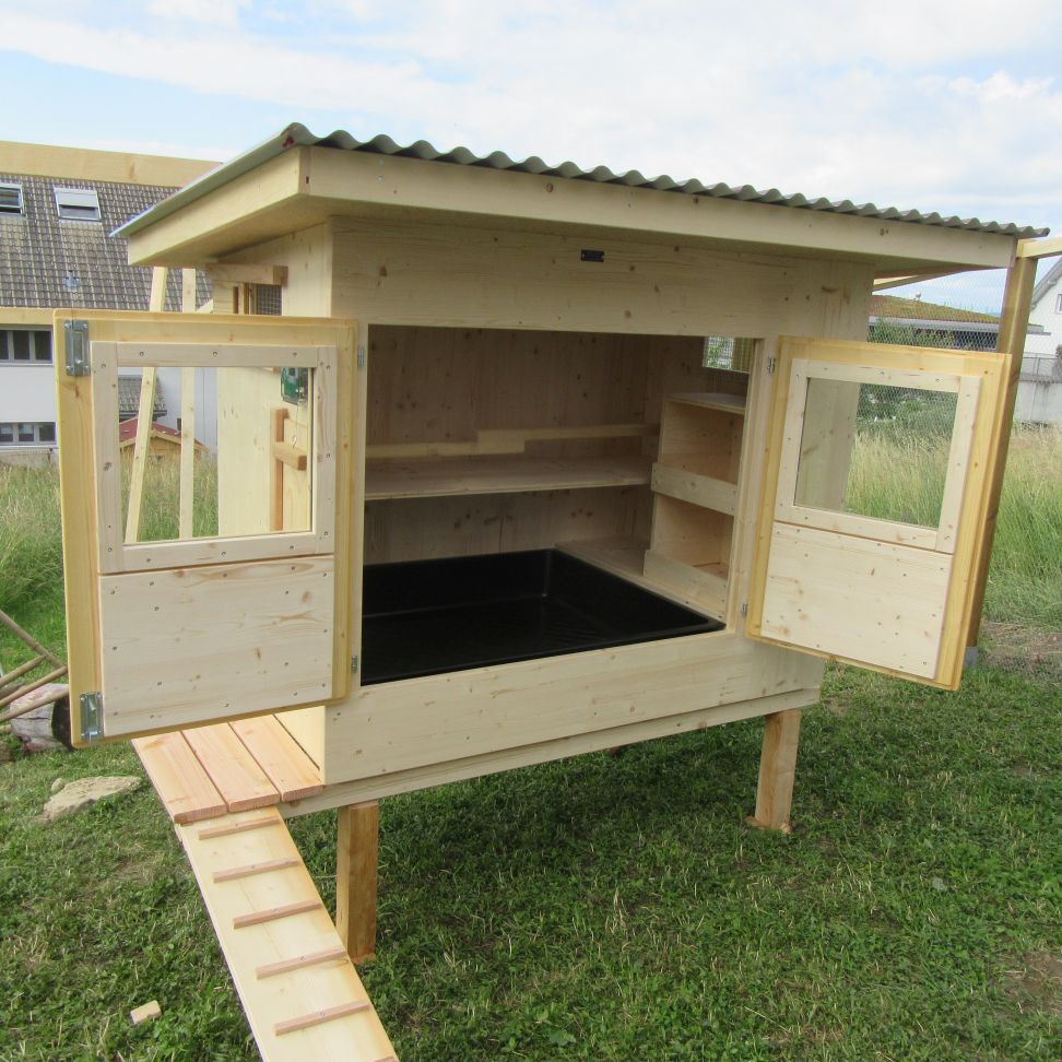 inkl. Inneneinrichtung: Kotbrett, darüber Sitzstange, Legekasten